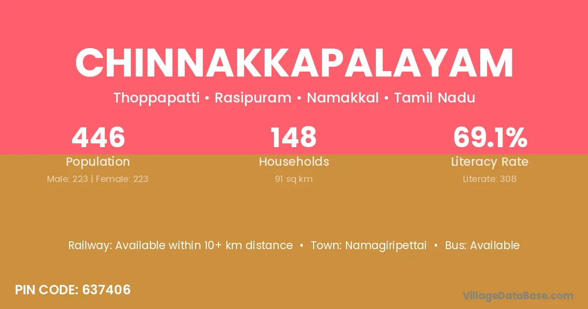 Chinnakkapalayam village has a total population of 446 people, of which 223 are males and 223 are females.