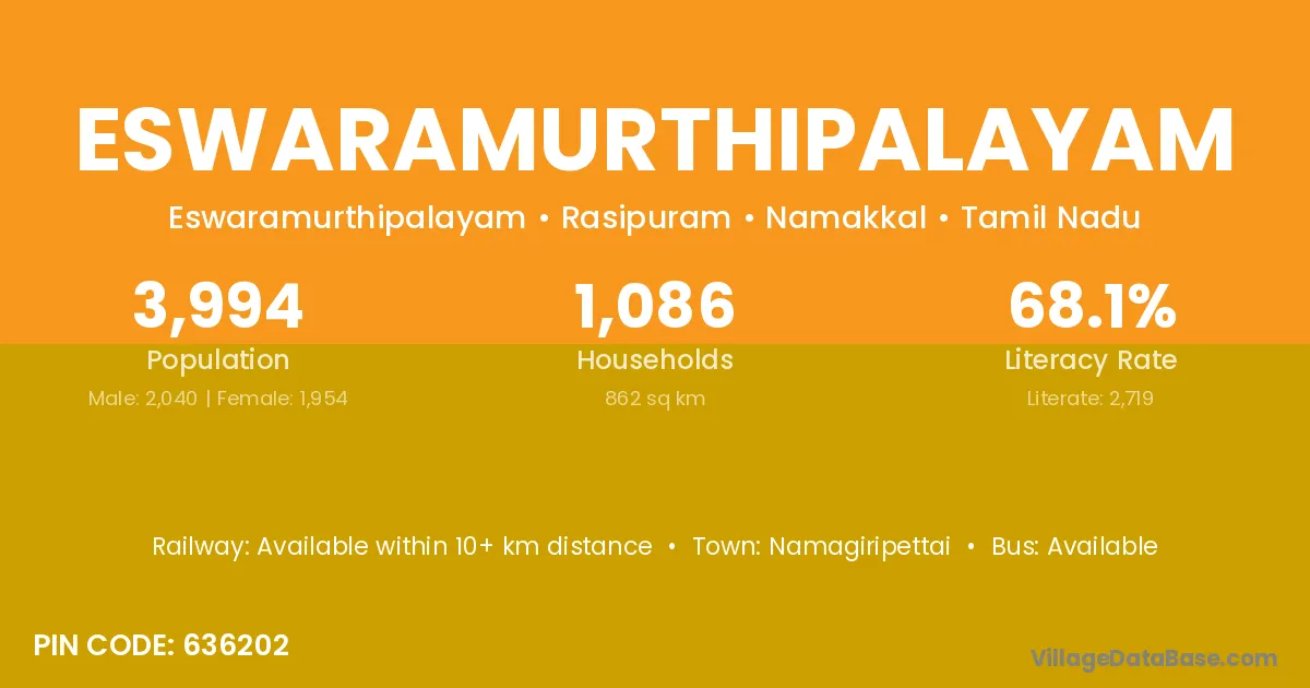 Eswaramurthipalayam village has a total population of 3,994 people, of which 2,040 are males and 1,954 are females.