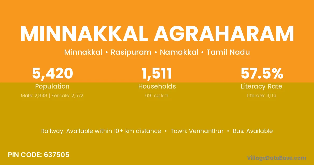 Minnakkal Agraharam village has a total population of 5,420 people, of which 2,848 are males and 2,572 are females.
