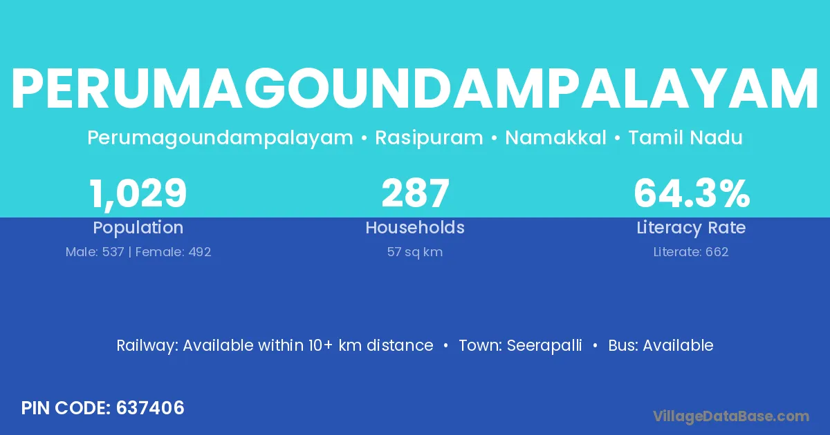 Perumagoundampalayam village has a total population of 1,029 people, of which 537 are males and 492 are females.