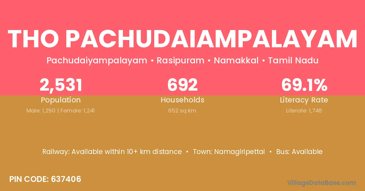 Tho Pachudaiampalayam village has a total population of 2,531 people, of which 1,290 are males and 1,241 are females.
