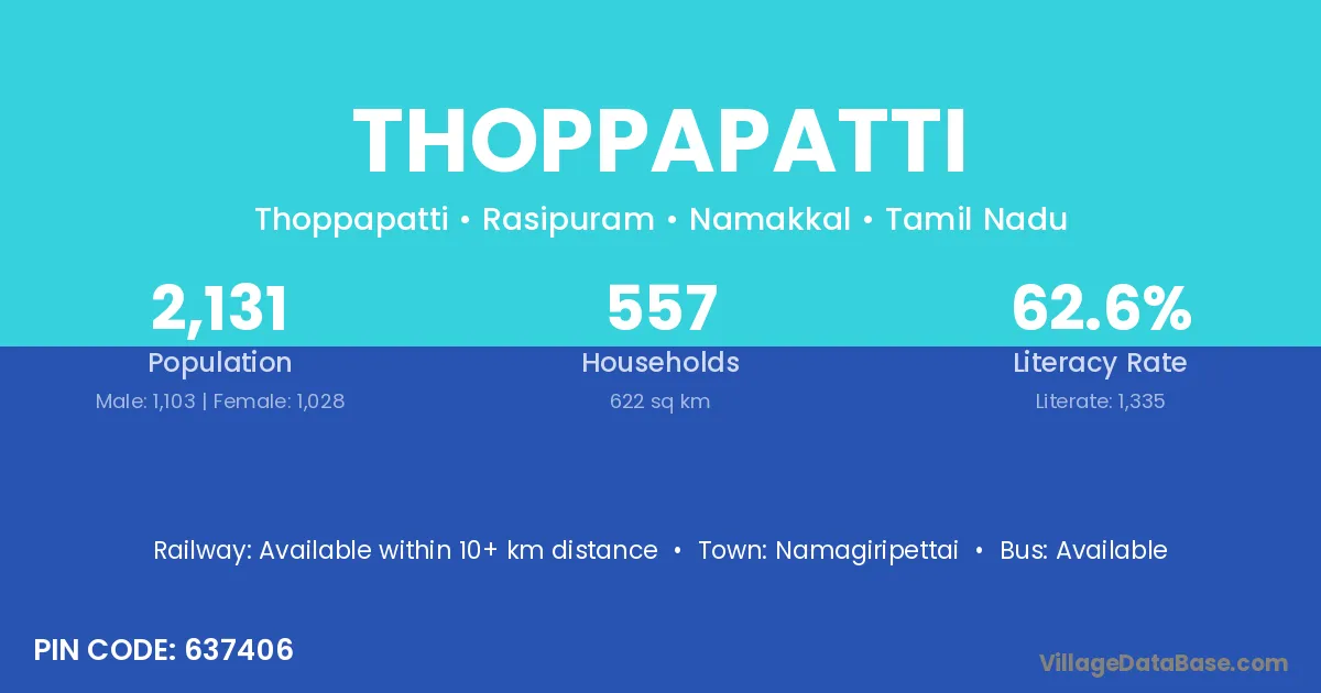 Thoppapatti village has a total population of 2,131 people, of which 1,103 are males and 1,028 are females.