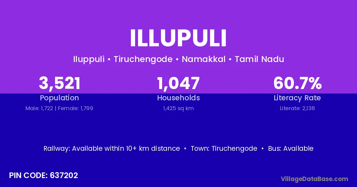 Tiruchengode is the nearest town to Illupuli village for major economic activities