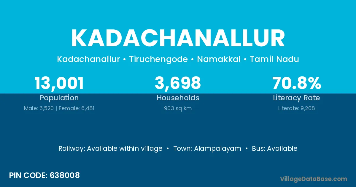 Kadachanallur village has a total population of 13,001 people, of which 6,520 are males and 6,481 are females.