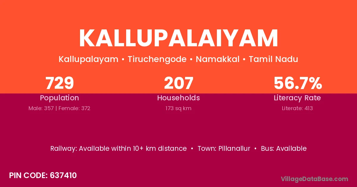 Kallupalaiyam village has a total population of 729 people, of which 357 are males and 372 are females.