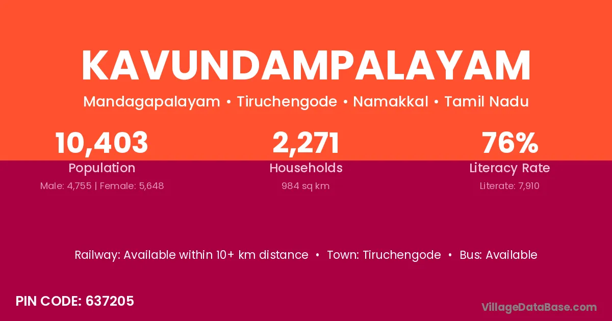 According to Census 2011 information, the village code of Kavundampalayam village is 637205.