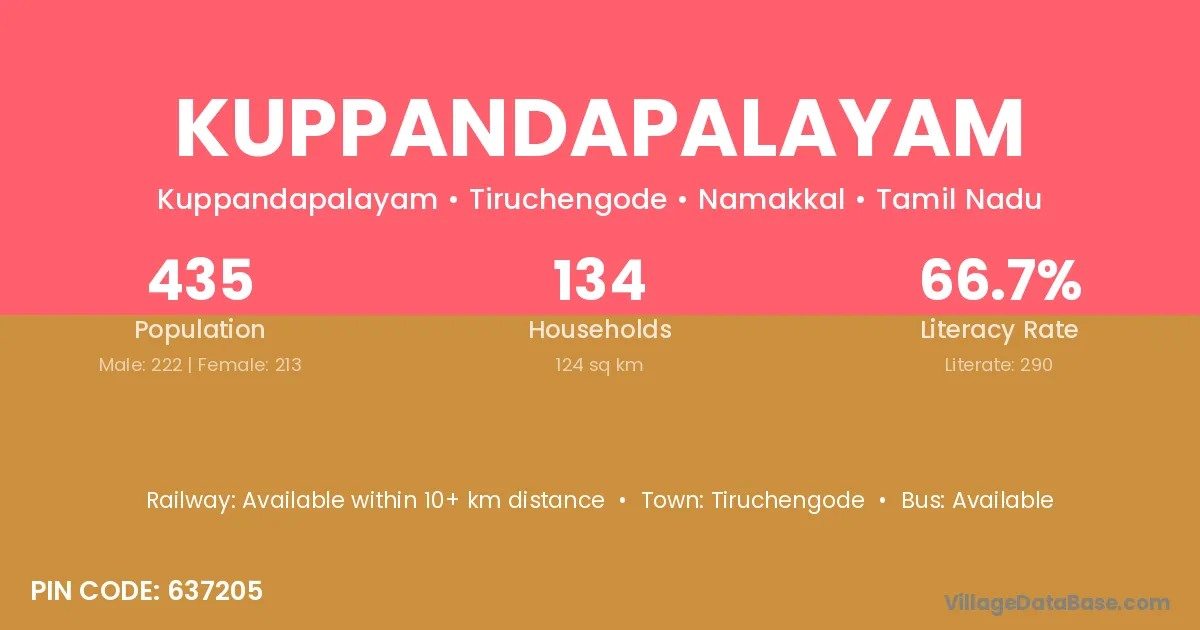 Kuppandapalayam village has a total population of 435 people, of which 222 are males and 213 are females.