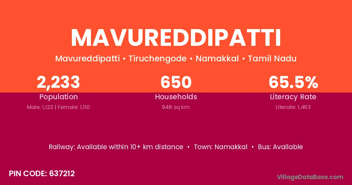Mavureddipatti village has a total population of 2,233 people, of which 1,123 are males and 1,110 are females.