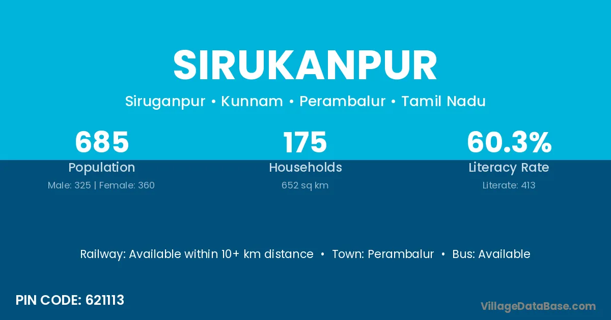 Perambalur is the nearest town to Sirukanpur village for major economic activities
