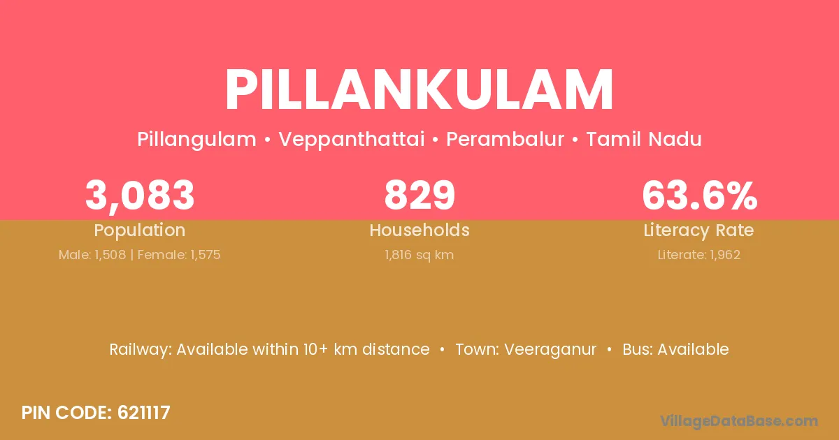 Pillankulam village has a total population of 3,083 people, of which 1,508 are males and 1,575 are females.