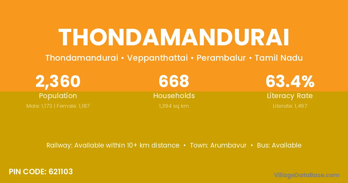 According to Census 2011 information, the village code of Thondamandurai village is 621103.