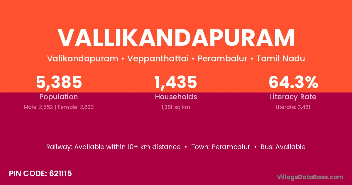 According to Census 2011 information, the village code of Vallikandapuram village is 621115.