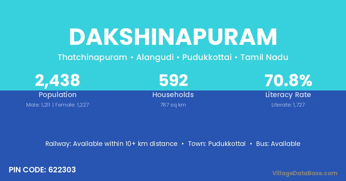 Dakshinapuram village has a total population of 2,438 people, of which 1,211 are males and 1,227 are females.