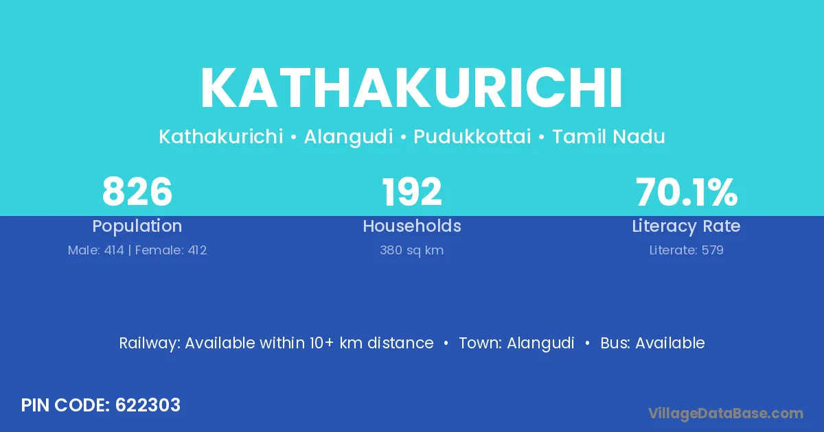 Kathakurichi village has a total population of 826 people, of which 414 are males and 412 are females.