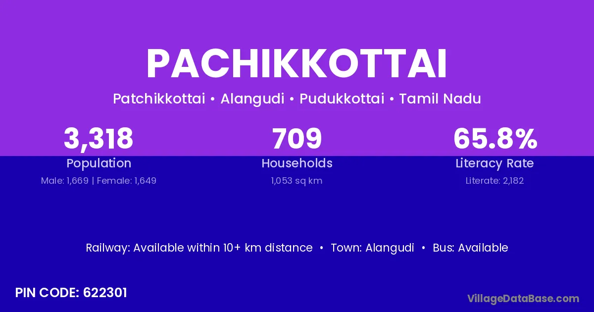 Pachikkottai village has a total population of 3,318 people, of which 1,669 are males and 1,649 are females.
