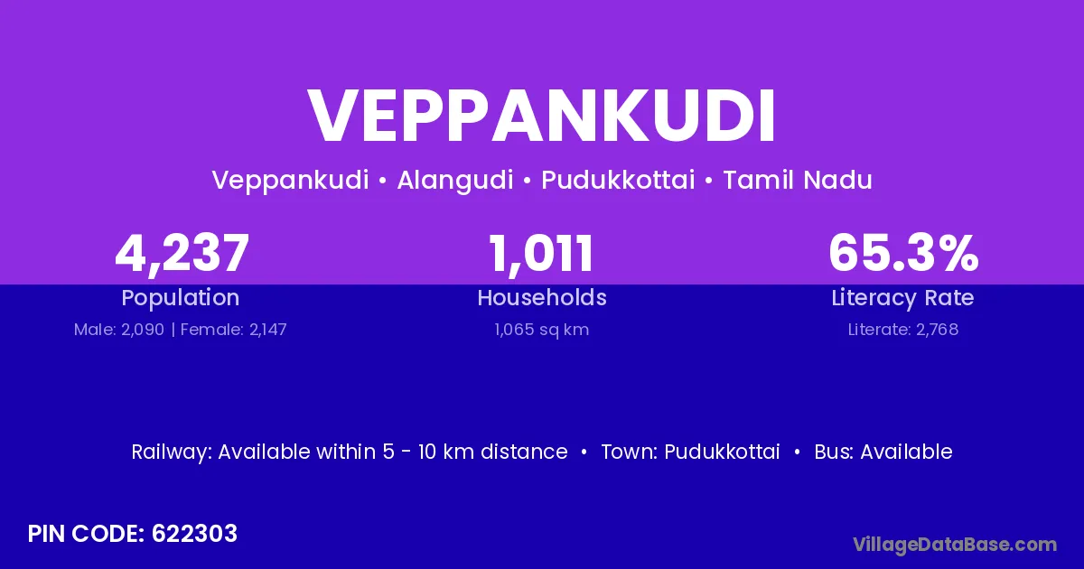 Veppankudi village has a total population of 4,237 people, of which 2,090 are males and 2,147 are females.