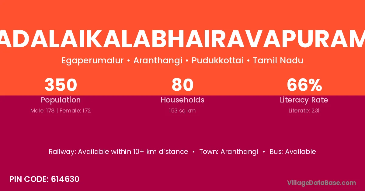 Adalaikalabhairavapuram village has a total population of 350 people, of which 178 are males and 172 are females.