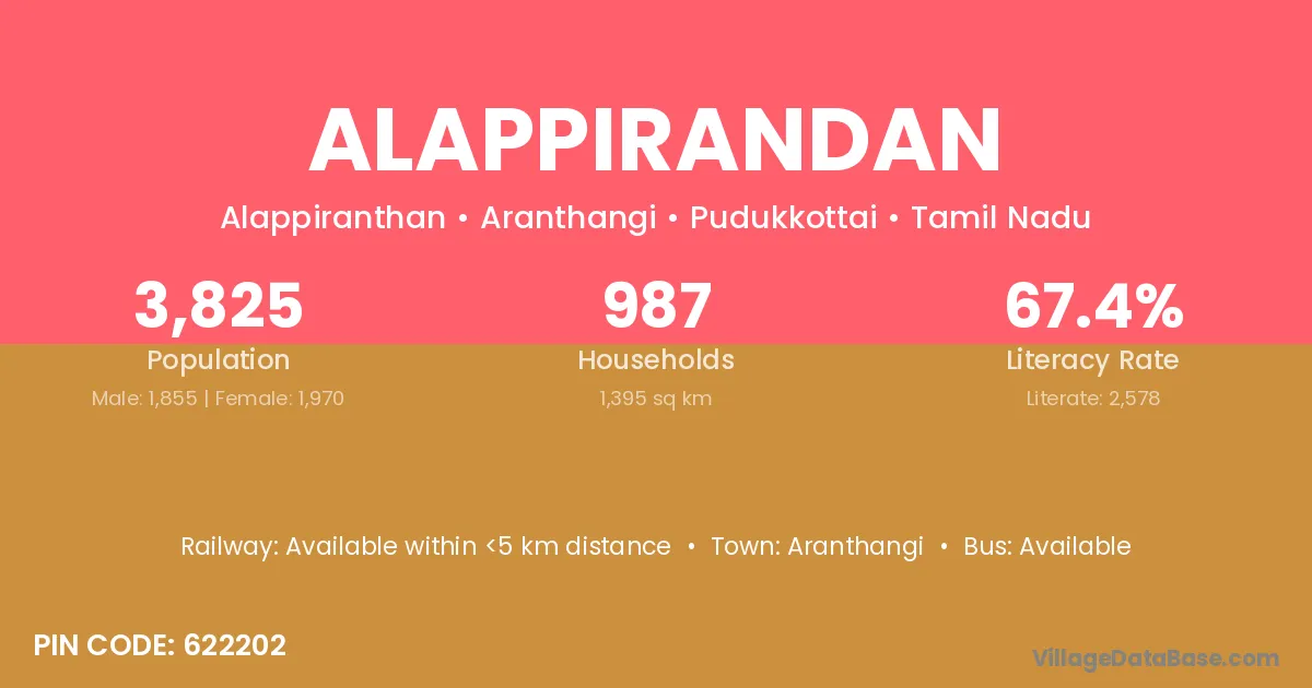 Alappirandan village has a total population of 3,825 people, of which 1,855 are males and 1,970 are females.