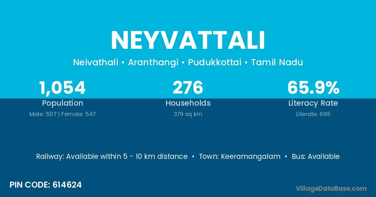 Neyvattali village has a total population of 1,054 people, of which 507 are males and 547 are females.