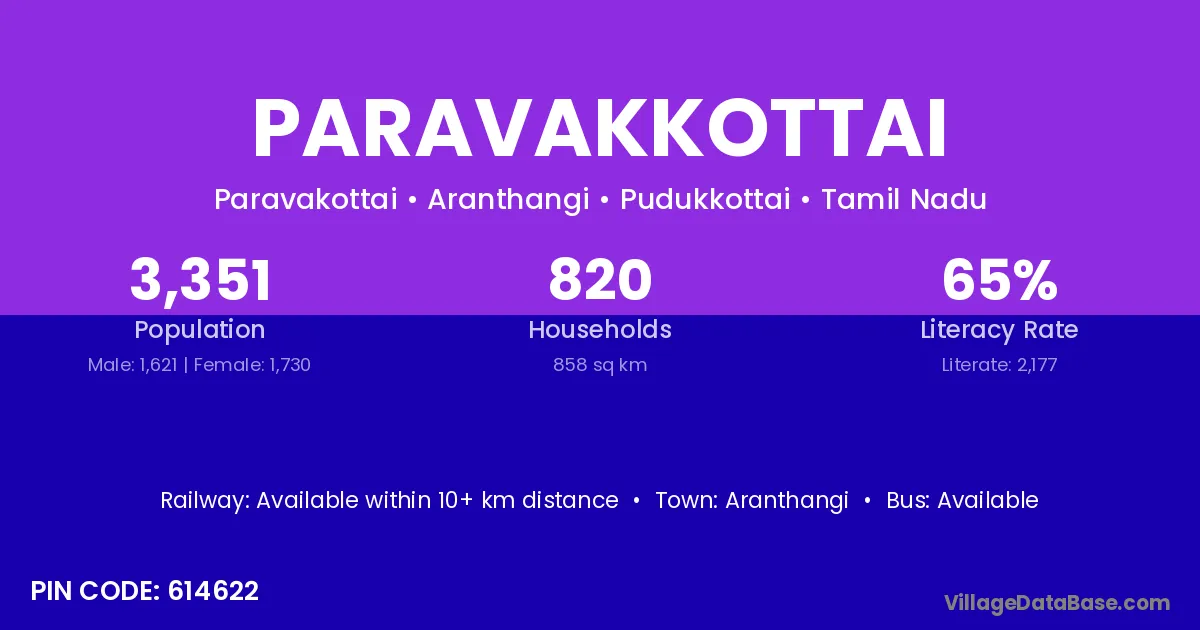 Paravakkottai village has a total population of 3,351 people, of which 1,621 are males and 1,730 are females.
