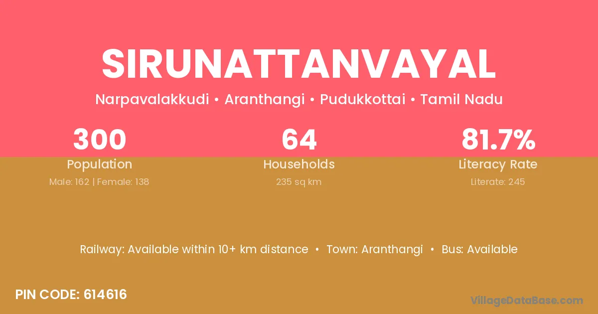 Sirunattanvayal village has a total population of 300 people, of which 162 are males and 138 are females.