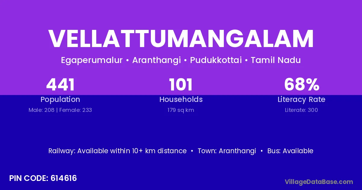 Vellattumangalam village has a total population of 441 people, of which 208 are males and 233 are females.