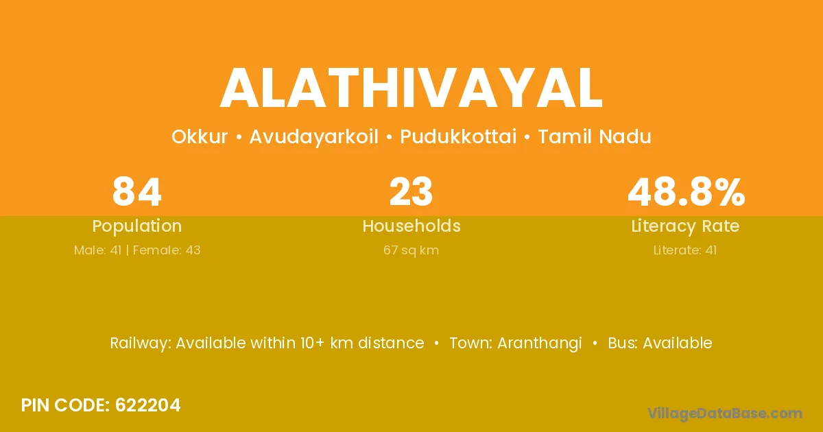 Alathivayal village has a total population of 84 people, of which 41 are males and 43 are females.