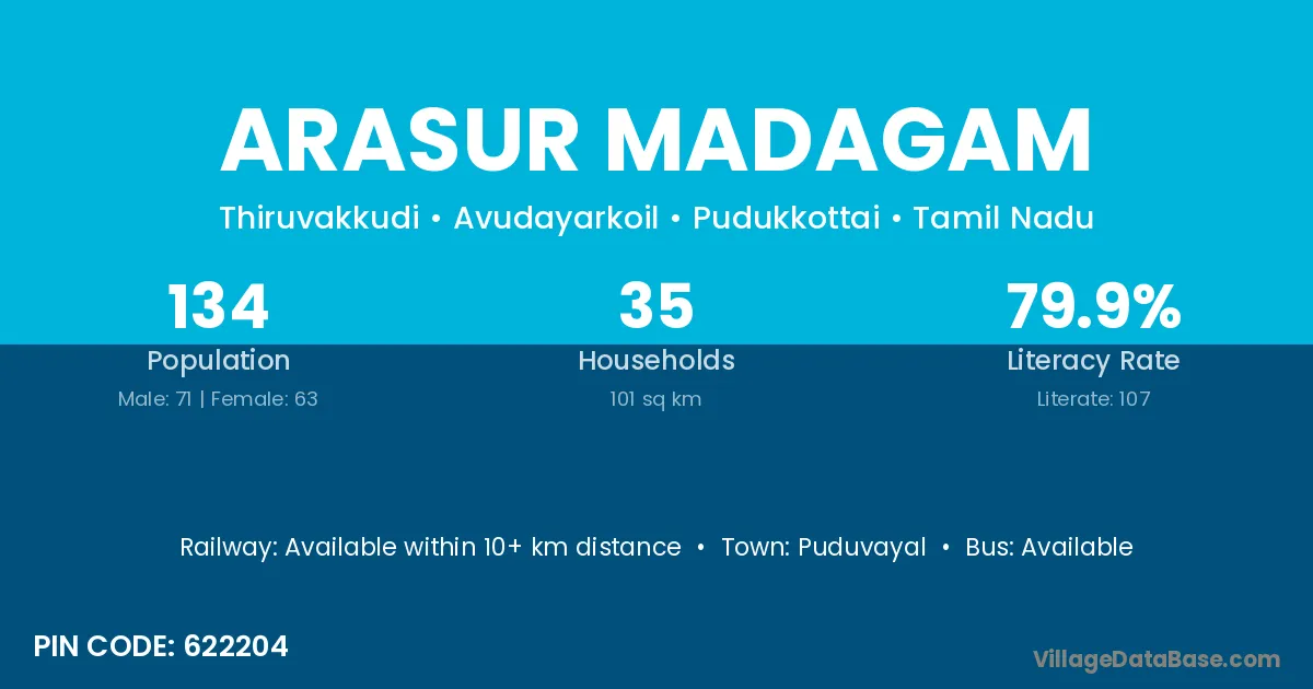 Arasur Madagam village has a total population of 134 people, of which 71 are males and 63 are females.