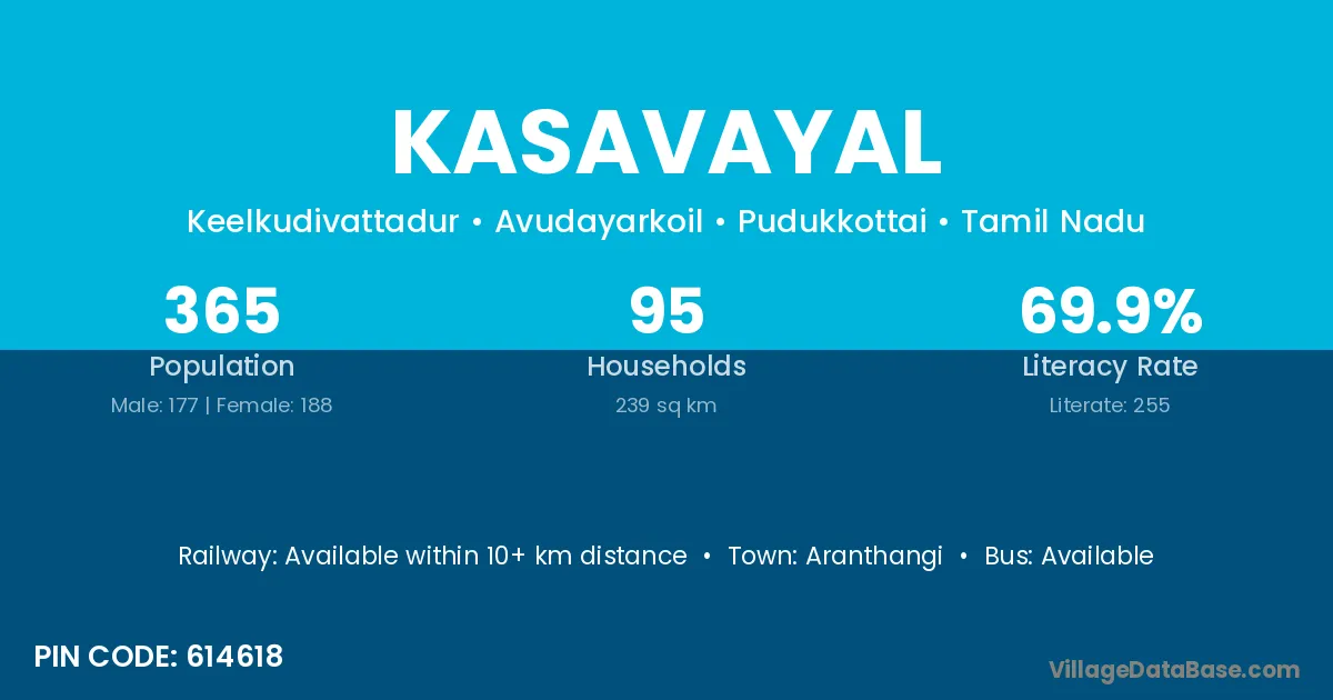 Kasavayal village has a total population of 365 people, of which 177 are males and 188 are females.