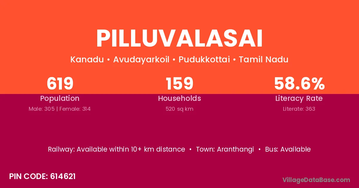 Pilluvalasai village has a total population of 619 people, of which 305 are males and 314 are females.