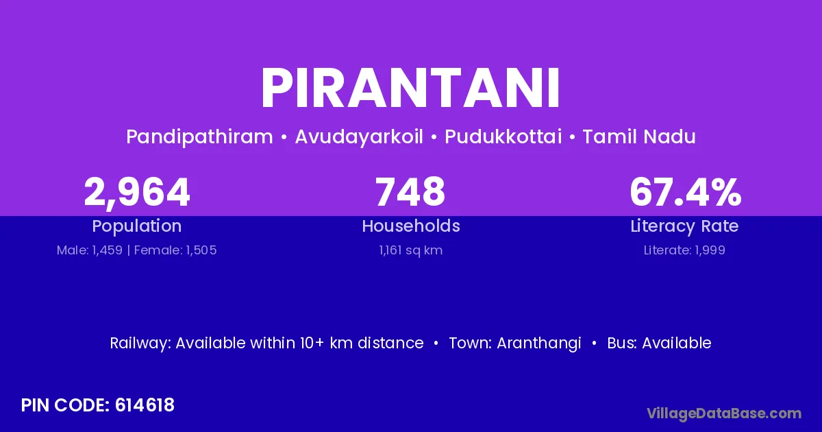 Aranthangi is the nearest town to Pirantani village for major economic activities