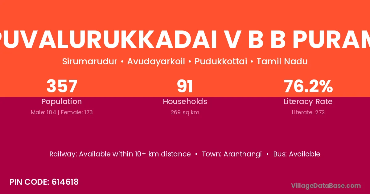 Puvalurukkadai V B B Puram village has a total population of 357 people, of which 184 are males and 173 are females.