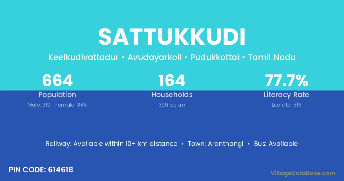 Sattukkudi village has a total population of 664 people, of which 319 are males and 345 are females.