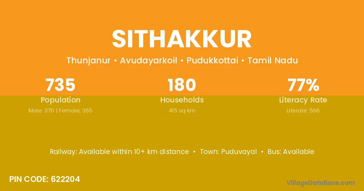 Sithakkur village has a total population of 735 people, of which 370 are males and 365 are females.