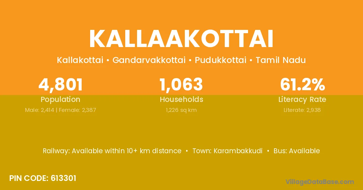 Kallaakottai village has a total population of 4,801 people, of which 2,414 are males and 2,387 are females.