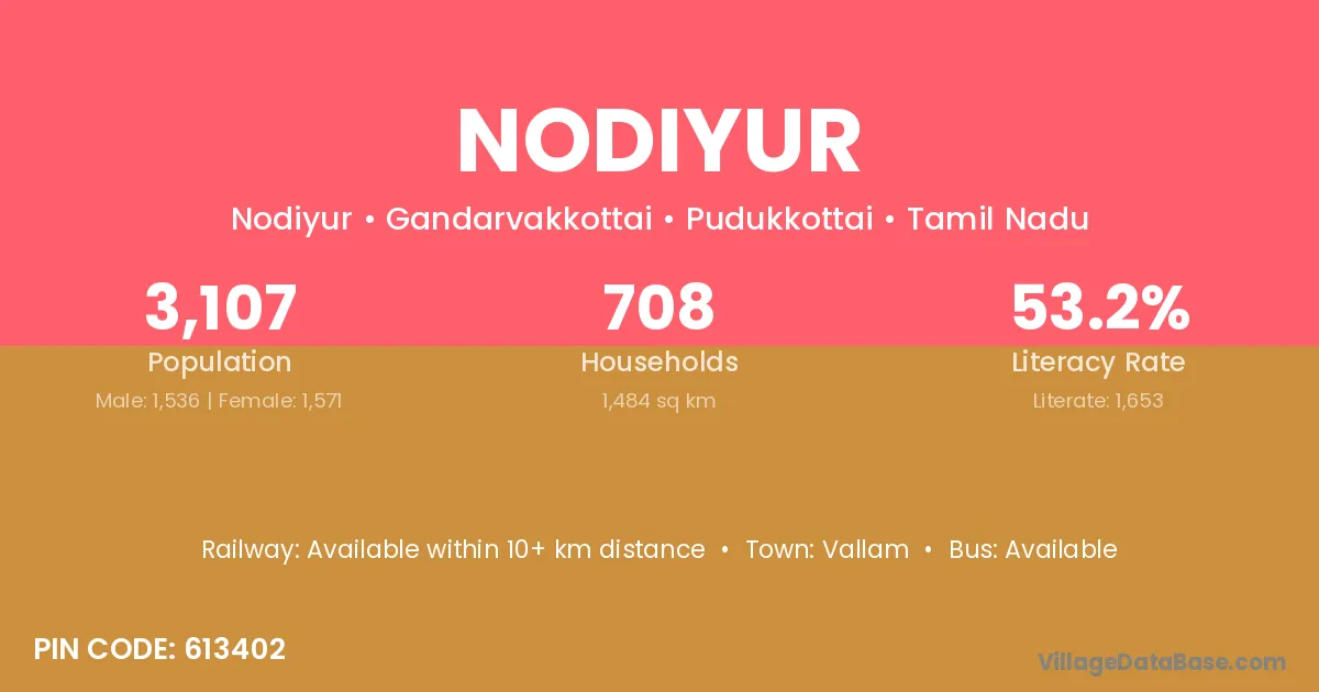 Nodiyur village has a total population of 3,107 people, of which 1,536 are males and 1,571 are females.