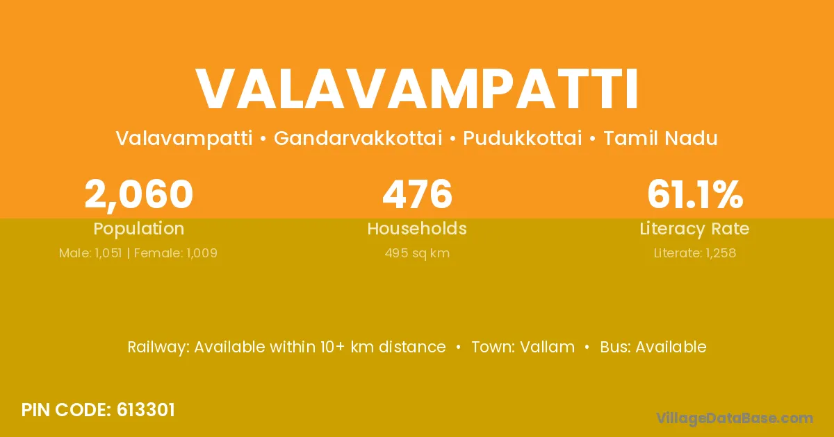 Valavampatti village has a total population of 2,060 people, of which 1,051 are males and 1,009 are females.