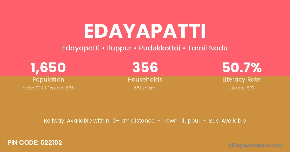 Edayapatti village has a total population of 1,650 people, of which 794 are males and 856 are females.
