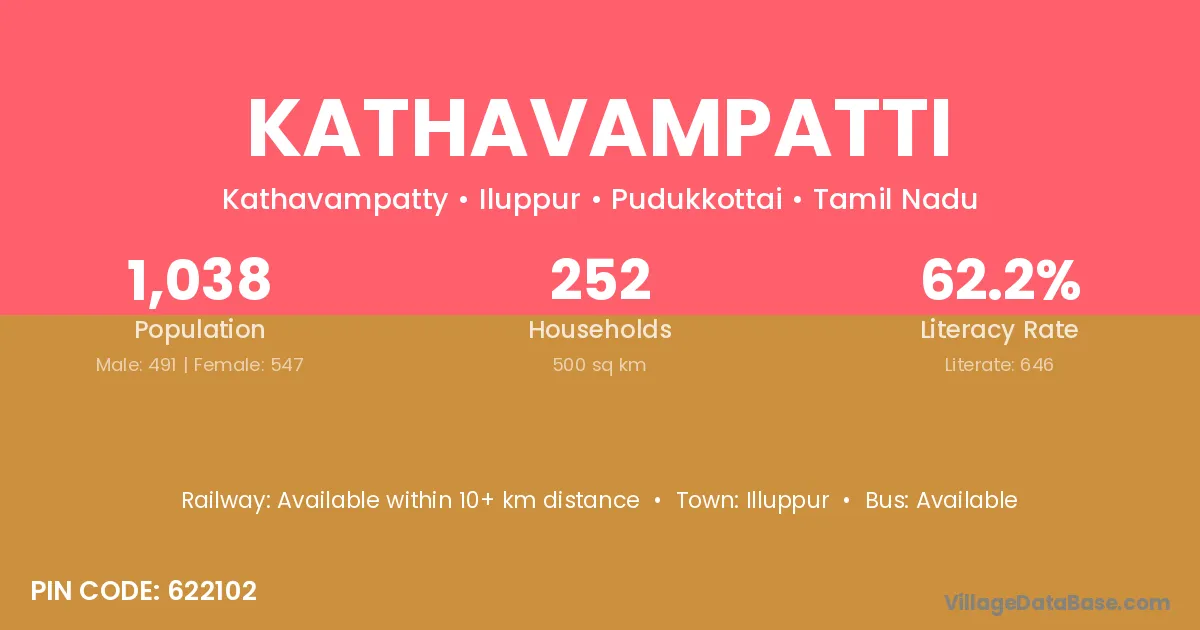 Kathavampatti village has a total population of 1,038 people, of which 491 are males and 547 are females.