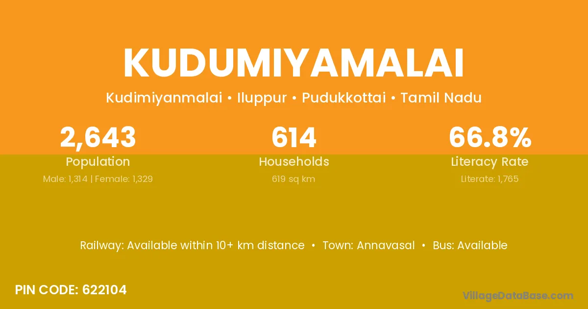 Kudumiyamalai village has a total population of 2,643 people, of which 1,314 are males and 1,329 are females.