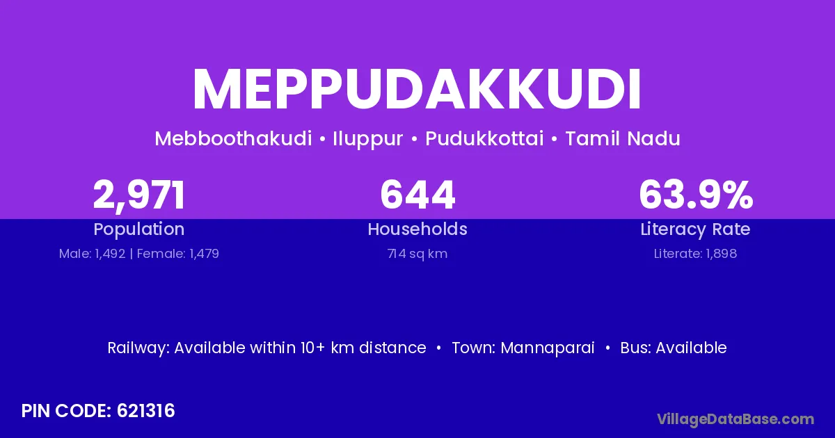 Meppudakkudi village has a total population of 2,971 people, of which 1,492 are males and 1,479 are females.