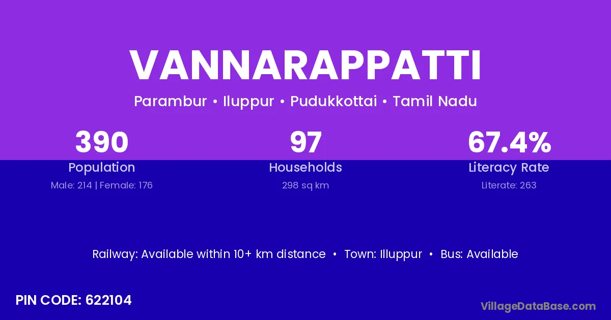 Vannarappatti village has a total population of 390 people, of which 214 are males and 176 are females.