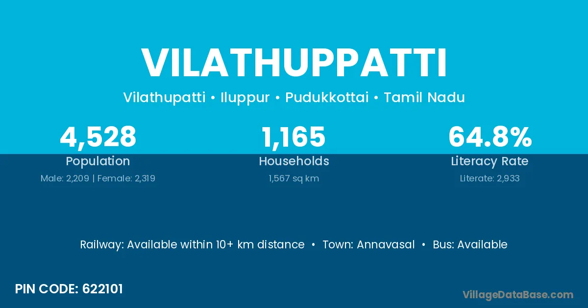 Vilathuppatti village has a total population of 4,528 people, of which 2,209 are males and 2,319 are females.