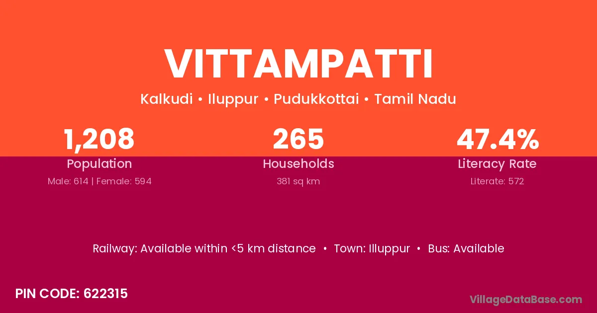 Vittampatti village has a total population of 1,208 people, of which 614 are males and 594 are females.