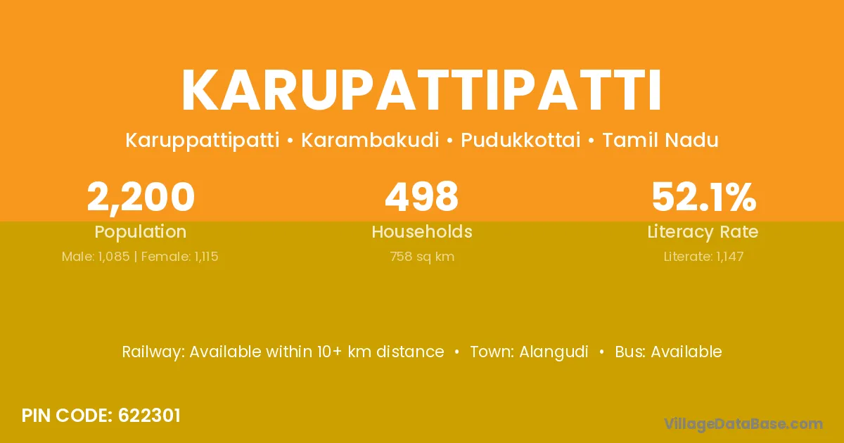 Karupattipatti village has a total population of 2,200 people, of which 1,085 are males and 1,115 are females.