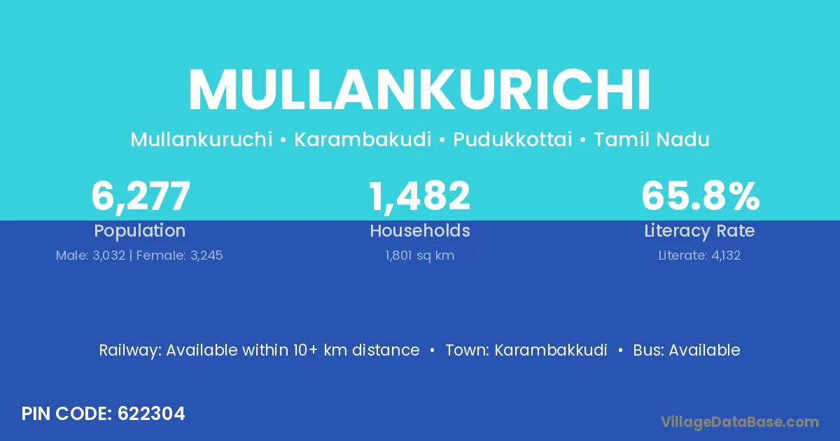 Mullankurichi village has a total population of 6,277 people, of which 3,032 are males and 3,245 are females.