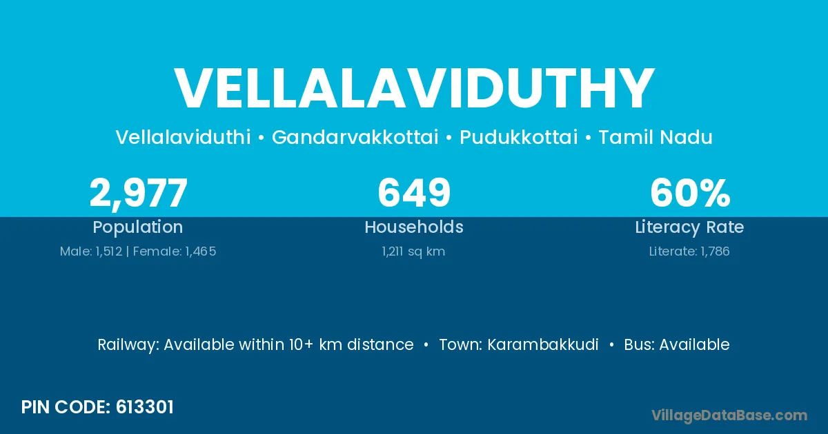 Alangudi is the nearest town to Vellalaviduthy village for major economic activities
