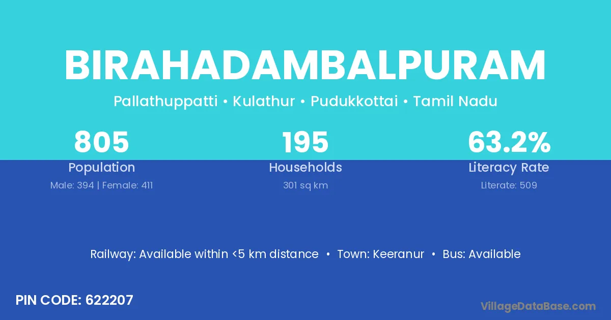 Birahadambalpuram village has a total population of 805 people, of which 394 are males and 411 are females.
