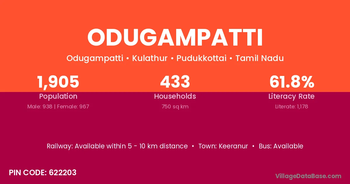 Odugampatti village has a total population of 1,905 people, of which 938 are males and 967 are females.