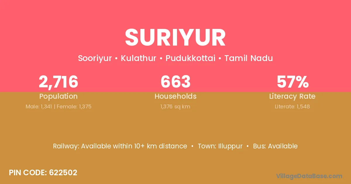 The literacy rate of Suriyur village is 57.00%. Male literacy stands at 66.22% and female literacy at 48.00%.